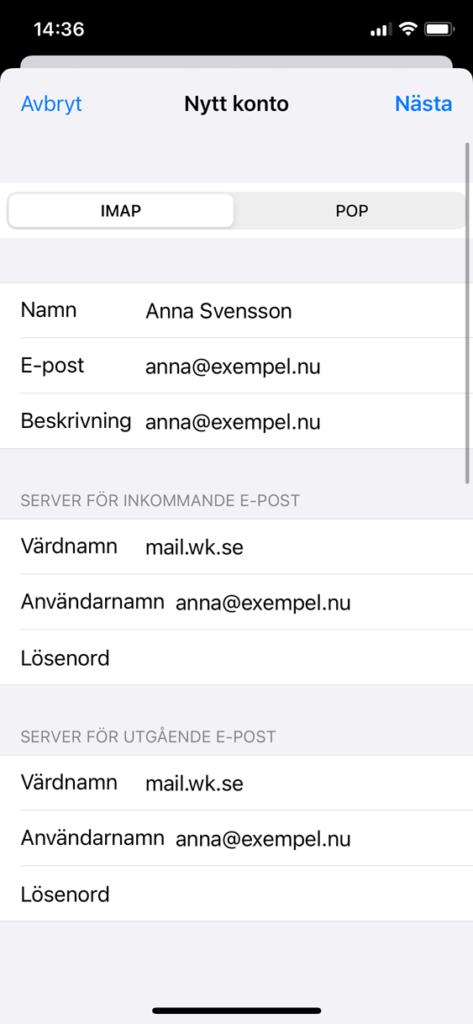 4. Välj IMAP och fyll sedan i följande uppgifter: